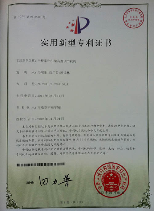 平板車(chē)牽引架高度調(diào)節(jié)機(jī)構(gòu)專利證書(shū)